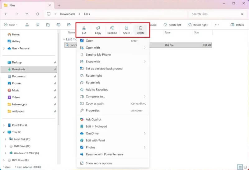 Chẳng hạn, context menu hiện được bổ sung các đường phân chia (dividers). Điều này giúp tách biệt rõ ràng các mục menu cấp cao nhất (Cut, Copy, Rename, Share, và Delete), từ đó tăng cường khả năng đọc.