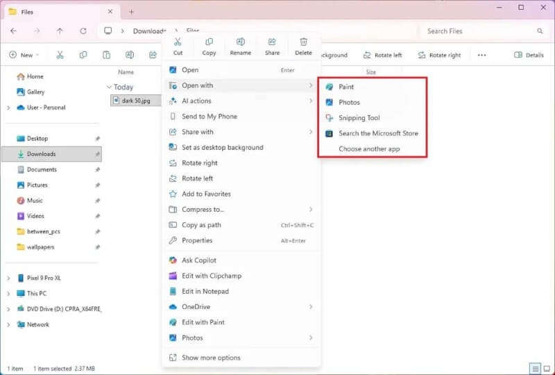 Đối với menu con “Open with” (Mở bằng), các biểu tượng đã được cập nhật với thiết kế gọn gàng hơn nhờ việc loại bỏ nền màu.