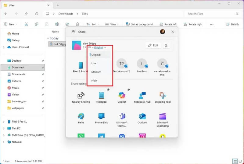 Khi chia sẻ hình ảnh, người dùng hiện có tùy chọn thay đổi mức độ nén tệp (file compression). Tùy chọn này nằm ngay bên dưới hình thu nhỏ xem trước, cho phép chọn các mức “Low” (Thấp), “Medium” (Trung bình), hoặc “High” (Cao).