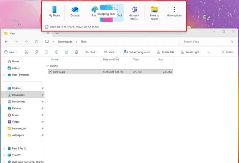 Ngoài ra, khi người dùng kéo và thả các tệp cục bộ từ File Explorer hoặc desktop, một hộp thoại bật lên (flyout) mới sẽ xuất hiện ở đầu màn hình. Điều này cho phép chia sẻ nội dung nhanh chóng với các ứng dụng được đề xuất.
