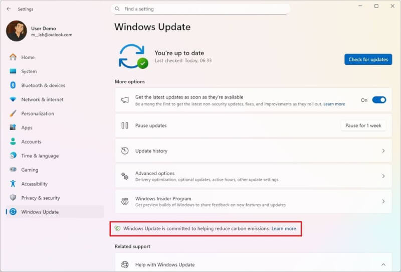 Từ phiên bản 22H2, cơ chế Windows Update có thể nhận biết khi máy tính được cắm sạc và kết nối internet. Nếu có dữ liệu về cường độ carbon tại khu vực đó, hệ thống sẽ tự động lên lịch cập nhật vào thời điểm có lượng khí thải carbon thấp nhất.
