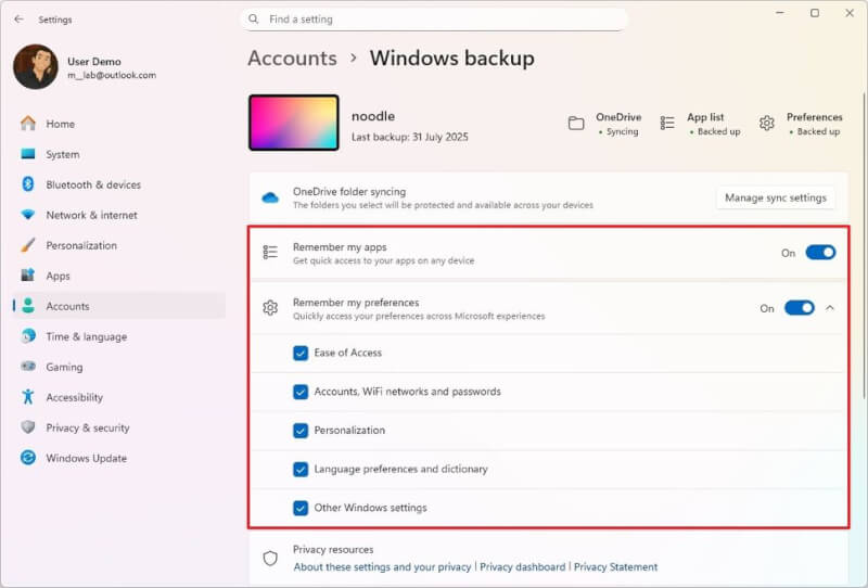 Khi bạn thiết lập một tài khoản Microsoft mới trên Windows 11, hệ thống sẽ tự động bật tính năng sao lưu vào đám mây.
