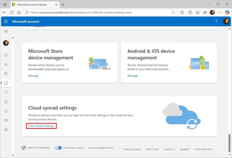 Ngoài ra, bạn cũng có thể xóa dữ liệu đã lưu trên đám mây bằng cách truy cập trang “Devices” trong tài khoản Microsoft và chọn “Clear synced data”.