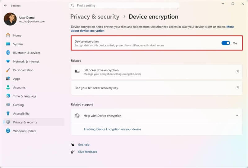 Từ phiên bản 24H2, khi cài đặt mới, Windows 11 sẽ tự động bật tính năng mã hóa thiết bị (BitLocker) và lưu khóa giải mã vào tài khoản Microsoft của bạn.