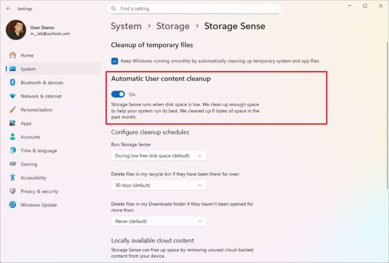 Theo cấu hình mặc định, Storage Sense sẽ tự động xóa các tệp trong thùng rác sau 30 ngày. Sau khi nâng cấp hệ điều hành, tính năng này cũng sẽ xóa bản sao lưu của cấu hình cũ sau 10 ngày. Ngoài ra, Storage Sense còn xóa các tệp OneDrive đã được tải lên đám mây, nhưng bạn vẫn có thể truy cập chúng từ thư mục OneDrive và cần có kết nối internet để tải lại.